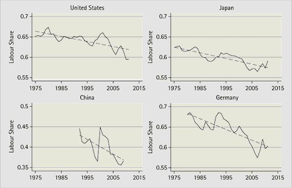 Three salient patterns in US and international data suggest that labor may indeed have become less scarce. A first is that laborâs share of national income has declined in the large majority of countries since the early 1980s. Figure 14.2, reproduced from Karabarbounis and Neiman (2014, KN hereafter), documents this trend specifically for the four largest world economies: the United States, Japan, China, and Germany. In all four countries, the labor shareâspecifically, the share of corporate gross value-added paid to laborâdeclined by roughly 2 to 4 percentage points per decade during the 1975-2010 period, with the precise time window differing by country according to data availability.