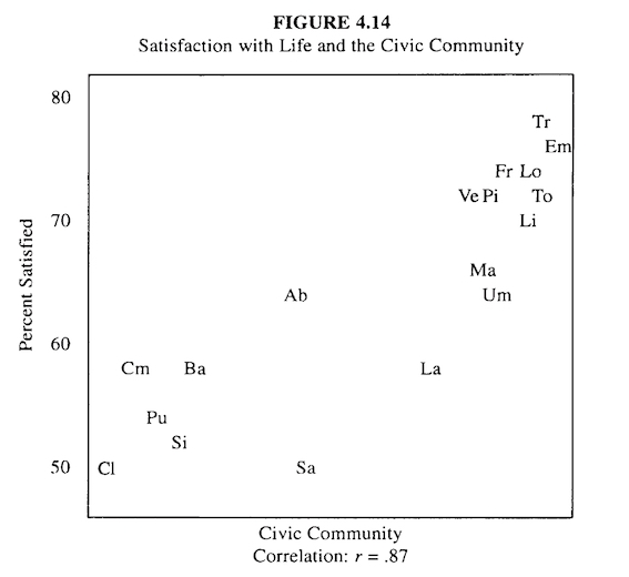 Aside: I feel Putnam et al are sometimes too enamoured of social structure — “networks of civic engagement” — versus the culture associated to that. Of course, structure and culture co-evolve.