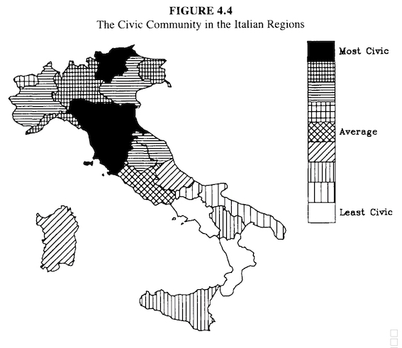 At the other pole are the “uncivic” regions, aptly characterized by the French term incivisme. Public life in these regions is organized hierarchically, rather than horizontally. The very concept of “citizen” here is stunted. From the point of view of the individual inhabitant, public affairs is the business of somebody else—i notabili, “the bosses,” “the politicians”—but not me. Few people aspire to partake in deliberations about the commonweal, and few such opportunities present themselves. Political participation is triggered by personal dependency or private greed, not by collective purpose. Engagement in social and cultural associations is meager. Private piety stands in for public purpose. Corruption is widely regarded as the norm, even by politicians themselves, and they are cynical about democratic principles. “Compromise” has only negative overtones.
