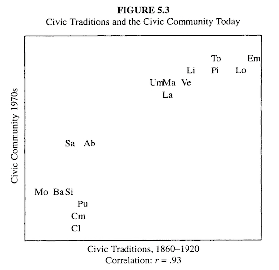 Despite this whirl of change, however, the regions characterized by civic involvement in the late twentieth century are almost precisely the same regions where cooperatives and cultural associations and mutual aid societies were most abundant in the nineteenth century, and where neighborhood associations and religious confraternities and guilds had contributed to the flourishing communal republics of the twelfth century. And although those civic regions were not especially advanced economically a century ago, they have steadily outpaced the less civic regions both in economic performance and (at least since the advent of regional government) in quality of government. The astonishing tensile strength of civic traditions testifies to the power of the past.