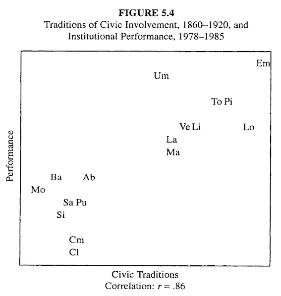 Figure 5.4 presents the correlation between institutional performance in the 1980s and civic traditions in 1860-1920. The pattern is stark: One could have predicted the success or failure of regional government in Italy in the 1980s with extraordinary accuracy from patterns of civic engagement nearly a century earlier.