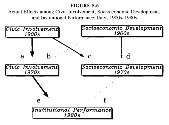 Figure 5.6 synthesizes our findings. Arrow b (the effect of economics on civics) is nonexistent, while arrow c (the effect of civics on economics) is strong—stronger even than arrow d. Moreover, arrow a (civic continuity) is very strong, while arrow d (socioeconomic continuity) is generally weak. A region’s chances of achieving socioeconomic development during this century have depended less on its initial socioeconomic endowments than on its civic endowments. Insofar as we can judge from this simple analysis, the contemporary correlation between civics and economics reflects primarily the impact of civics on economics, not the reverse.