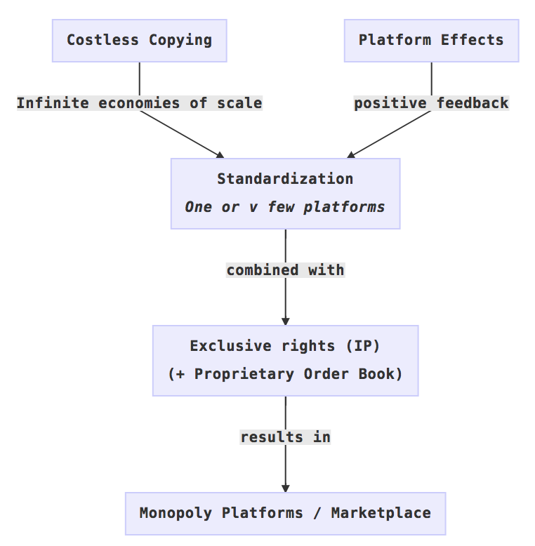 Platform effects combined with exclusive monopoly rights (copyright and patents) and a proprietary order book leads to monopoly. This is a problem because a monopoly is bad for consumers, providers and long-term innovation.