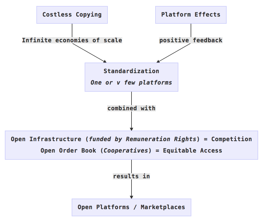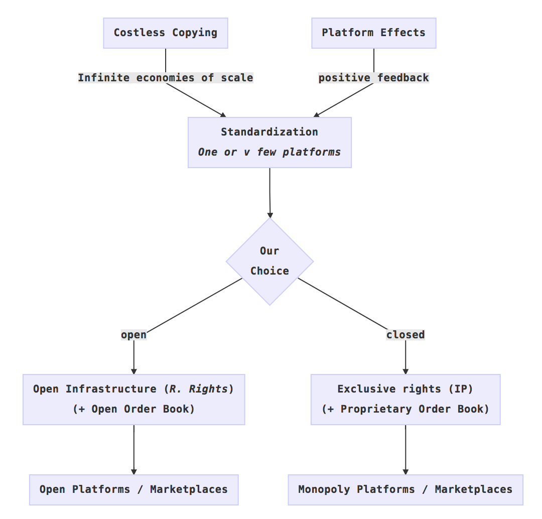 Summary: we can have monopoly platforms or open ones – it’s our choice. Open platforms can be achieved by replacing monopoly rights with open-compatible remuneration rights as a method of funding platform infrastructure, and replacing a proprietary order book with an open (where an order book exists).
